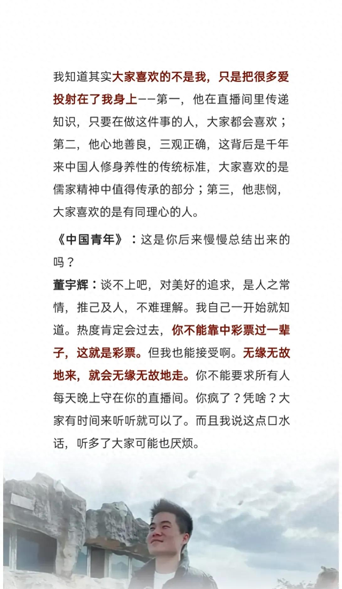 直播节目是他与观众之间的纽带,通过这个平台,他不仅分享着自己的生活和工作经历,更是与粉丝们建立起了一种亲密的联系。在他的直播间里,粉丝们不仅仅是观众,更像是他的朋友和伙伴。无论是开会还是筹备活动,董宇辉都会第一时间向粉丝们报告进展,分享心情,引起粉丝们的共鸣和支持。这种真诚而坦率的态度,让他赢得了无数粉丝的心。