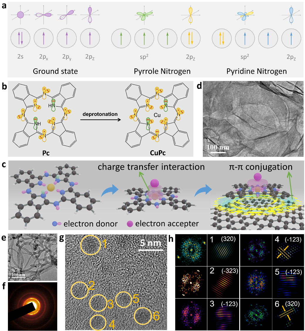 吡咯N和吡啶N原子的等性和非等性sp2杂化(a)。Pc和CuPc中氮原子的孤对电子(b)。CuPc的结构和碘正极的电荷转移作用示意图(c)。CuPc@rGO和CuPc@CNT的HRTEM图像(d-e)。CNT上CuPc的单晶纳米颗粒(g)和相应的快速傅里叶变换(FFT)分析(f)。由HRTEM图像进行傅里叶逆变换的二维投影(h)。