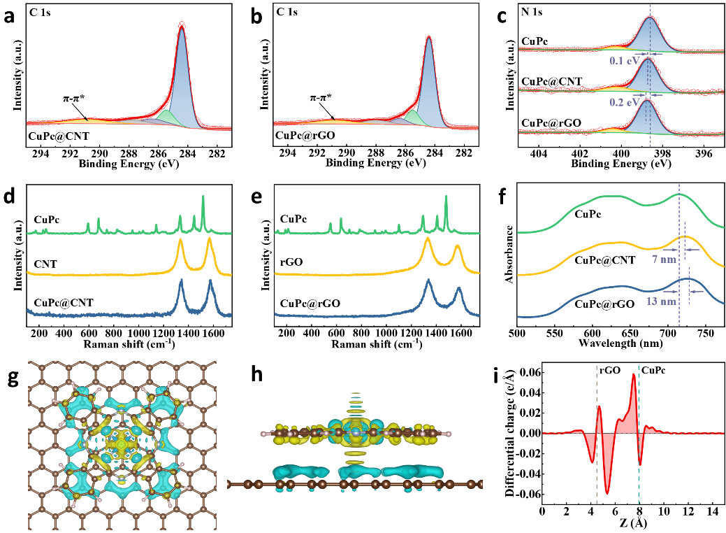 CuPc@CNT(a)和CuPc@rGO(b)的XPSC1s光谱。CuPc@CNT和CuPc@rGO的XPSN1s光谱(C)。CuPc、CNT、CuPc@CNT的拉曼光谱(d)。CuPc、rGO、CuPc@rGO的拉曼光谱(e)。CuPc、CuPc@CNT和CuPc@rGO的紫外-可见光谱(f)。CuPc@rGO的差分电荷密度俯视图(g)和侧视图(h)。CuPc@rGO差分电荷密度沿z轴的局部积分曲线(i)。