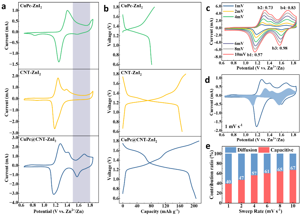 CuPc-ZnI2、CNT-ZnI2和CuPc@CNT-ZnI2在1mVs-1的循环伏安曲线(a)。CuPc-ZnI2、CNT-ZnI2和CuPc@CNT-ZnI2在0.5Ag-1的恒流充放电曲线(b)。CuPc@CNT-ZnI2在不同扫速下的CV曲线(c)。CuPc@CNT-ZnI2在1mVs-1的CV曲线和赝电容贡献的容量标记(d)。不同扫速下扩散行为和赝电容行为贡献的容量占比(e)。