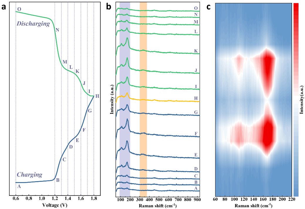 用于原位拉曼和非原位紫外测试的典型恒流充放电曲线(a)。CuPc@rGO-ZnI2在不同电压下的原位拉曼光谱(b)。CuPc@rGO-ZnI2在60-220cm-1之间的精细拉曼谱图(c)。