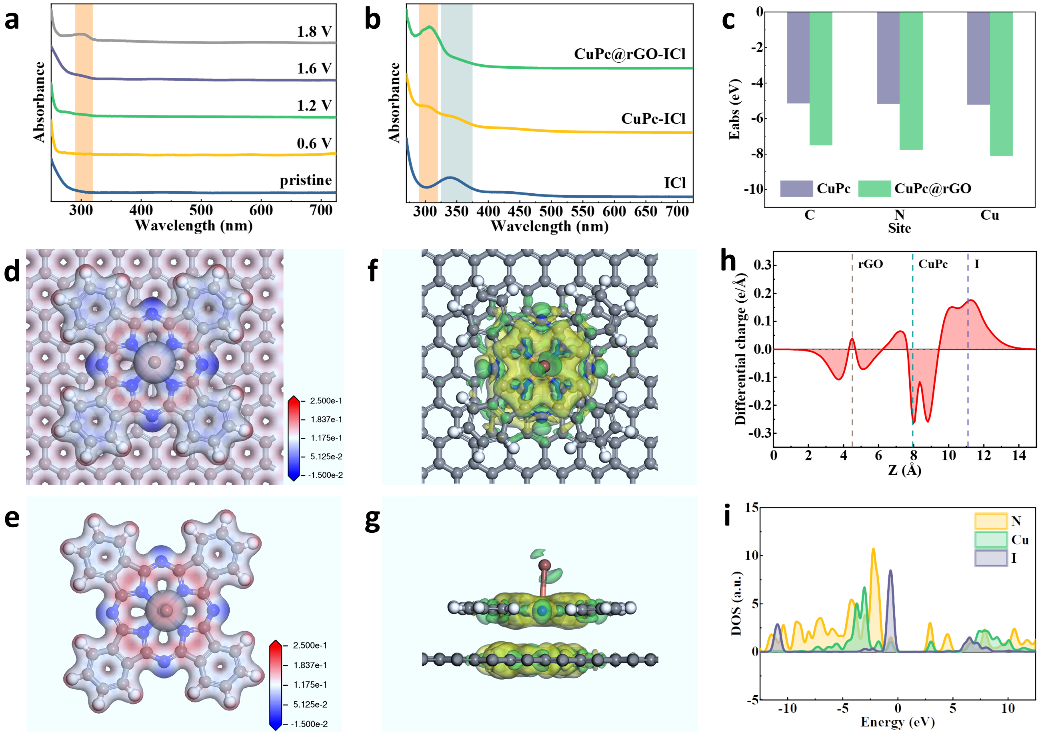 CuPc@rGO-ZnI2在原始和不同充放电阶段的非原位紫外光谱(a)。ICl与CuPc和CuPc@rGO配合物的紫外光谱(b)。计算的和CuPc、CuPc@rGO之间的吸附能(c)。计算的和CuPc@rGO(d)、CuPc(e)之间的分子静电势。计算的和CuPc@rGO相互作用差分电荷密度的俯视图(f)和侧视图(g)。计算的I和CuPc@rGO相互作用差分电荷密度沿着z轴的局部积分曲线(h)。计算的和CuPc@rGO相互作用中N、Cu、I的态密度(i)。