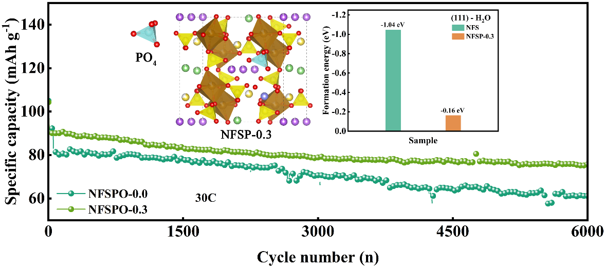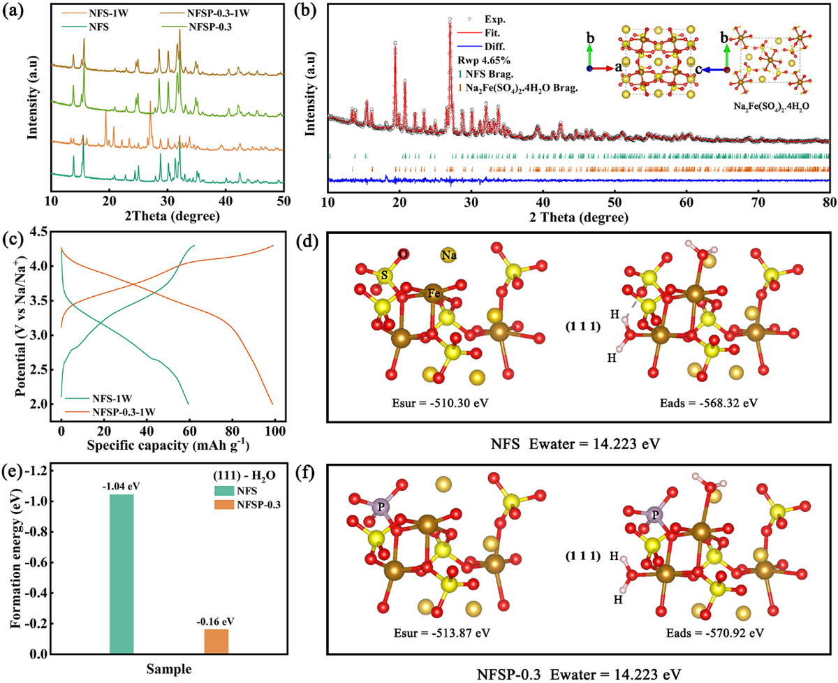 Na2+2xFe2-x(SO4)3类材料的空气不稳定性一直是制约其应用的重要因素之一。通过PO43-掺杂替换部分SO42-,抑制了其吸水性,将其暴露在空气中仍然可以保持无吸附水的主相结构。这是因为PO43-的引入大大降低了其晶面吸附水的结合能,使其不易生成水合相。