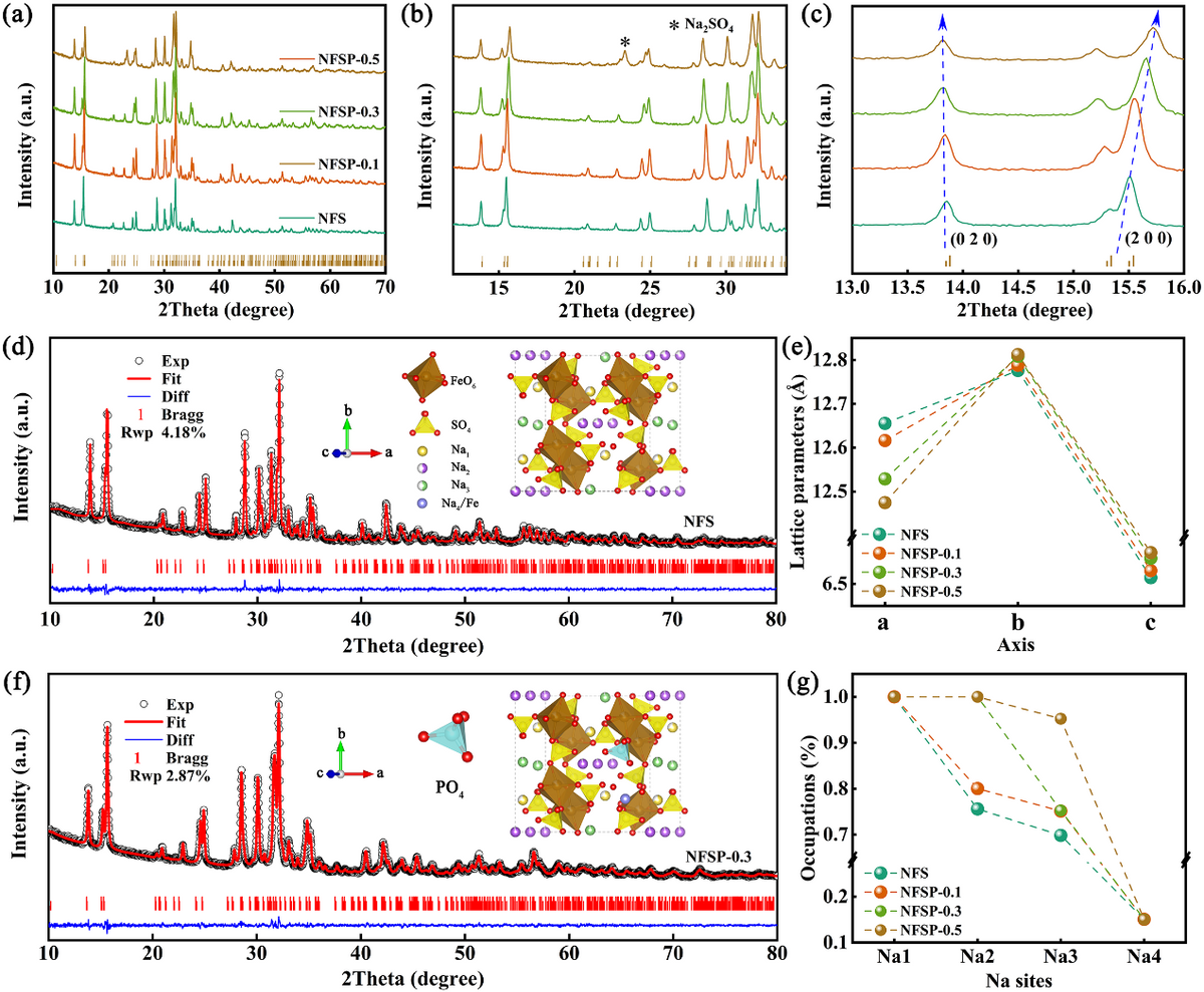 “P”的掺入并不改变主相的结构,其占据在“S2”位点,半径更大的“P”原子会使晶面间距发生改变,晶胞体积变大,从而更有利于钠离子扩散。同时,用于平衡电荷的钠离子会优先占据在能量更低的Na2位点,随后占据Na3位点。过多的PO43-掺杂会导致杂相Na2SO4的生成,不利于结构的稳定性。