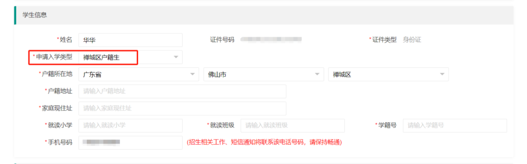 1.禅城区户籍小学应届毕业生:【申请入学类型】选择“禅城区户籍生”。