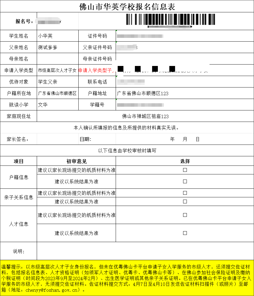 注意:以市级高层次人才子女身份报名,但未在优粤佛山卡平台申请子女入学服务的市级人才,还须提交佐证材料,包括报名信息表、人才资格证明(如领军人才证明、优粤卡、优粤佛山卡等)、在佛山参加社会保险证明及缴纳个税证明(时间段为2023年9月至2024年2月)、出生医学证明(或其他亲子关系证明)。佐证材料提交方式:4月7日至4月10日发送佐证材料扫描件(或照片)至邮箱(地址:chenyy@)。已在优粤佛山卡平台申请子女入学服务的市级人才,在招生系统报名后,无须提交佐证材料。