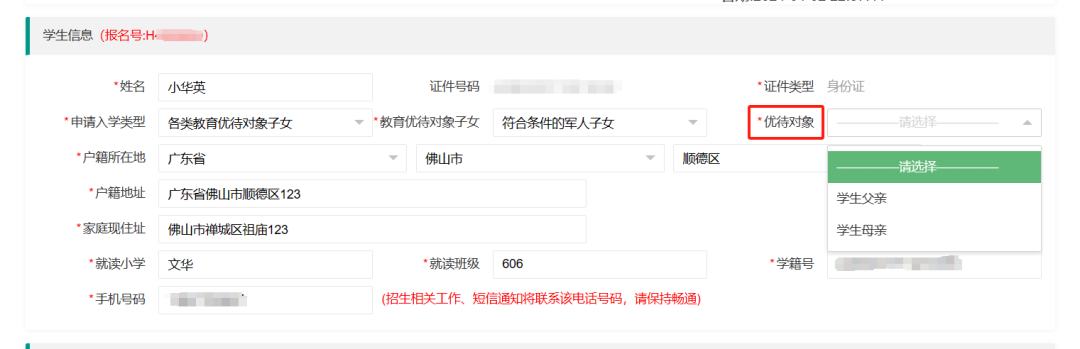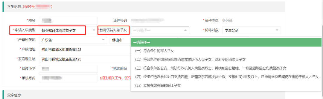 4.各类教育优待对象子女:【申请入学类型】选择“各类教育优待对象子女”→【教育优待对象子女】选择家长所属的类型进行填报→【优待家长】选择符合条件的一方身份。
