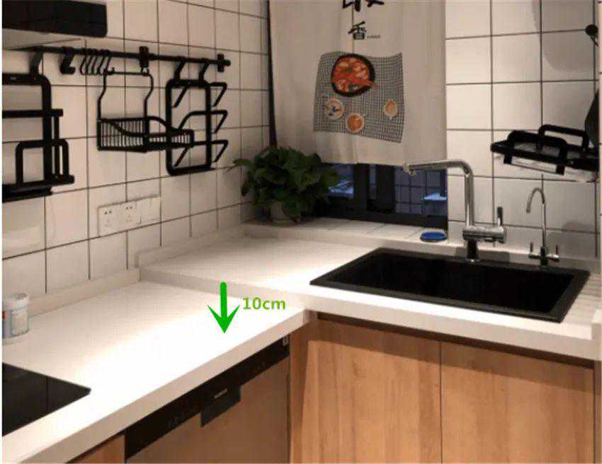可将洗菜区域的台面设计的略高于炒菜台面10cm,方便日后使用。