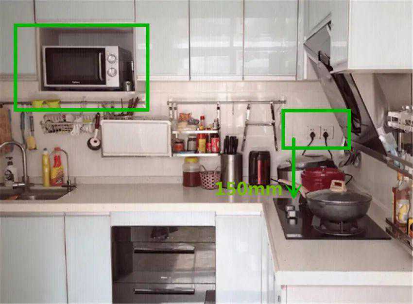 若吊柜内需要放置小电器,内置插座高度为1800mm最佳。当然柜内插座不要规划得太多,避免后续使用发生危险。