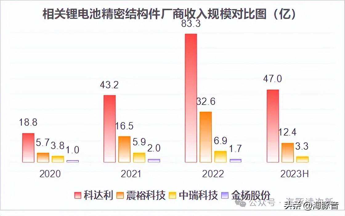 相比之下中瑞股份则更为“专情”,其收入几乎全部来自锂电池盖帽产品,2021、2022年公司收入分别同比大增56%、16%,到2022年收入规模已达6.9亿,是金扬股份圆柱电池领域收入规模的四倍,不过距离方形锂电池结构件厂商科达利(83亿)、震裕科技(32亿)的收入规模还很大差距。