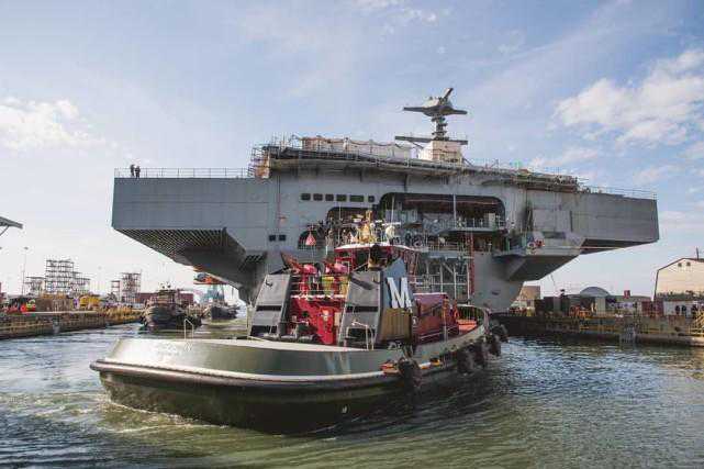 和大多数下水不久的水面舰艇一样,由于舰上动力系统还无法使用,因此“肯尼迪”号想要出坞,还得借助照片中这些小型拖船的帮助。报道称,在多达6艘拖船的共同协作下,这艘满载排水量逼近11万吨级的海上巨兽,才得以从纽波纽斯特造船厂的第12号船坞中顺利“脱身”。