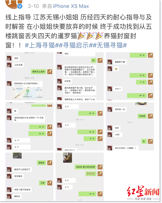 “凌晨3点,家里的猫自己把门打开,另一只狸花猫就傻了吧唧地溜出去了,我们贴了寻猫启事没消息,就联系了职业寻猫团队,找到猫基本只花了2小时不到……”