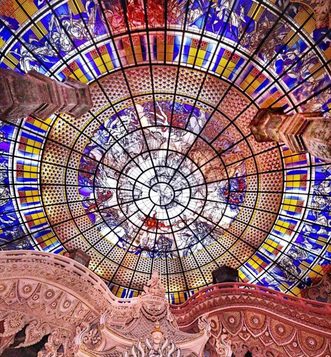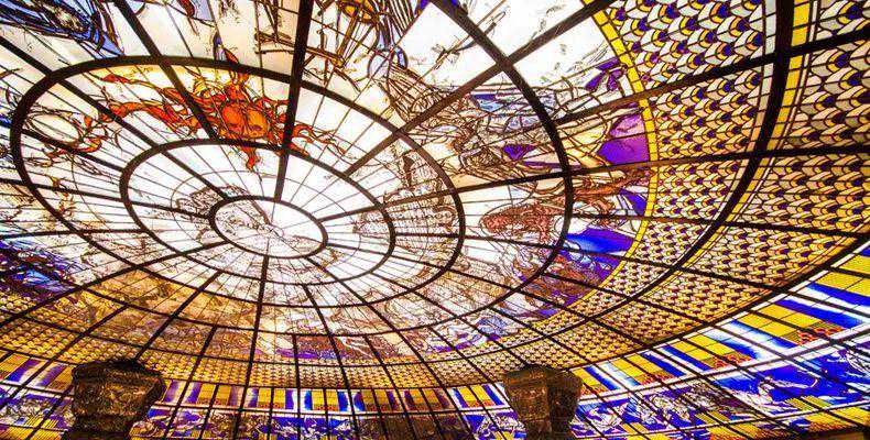 继续向上,楼梯顶端就到达了电梯等待区,可近观穹顶,穹顶上让人震撼的蓝色手绘彩画玻璃,由德国艺术家绘制的五大洲以及12星象图,暗喻了宇宙的浩瀚无垠。