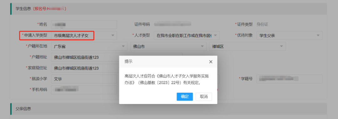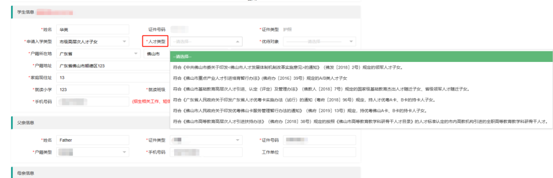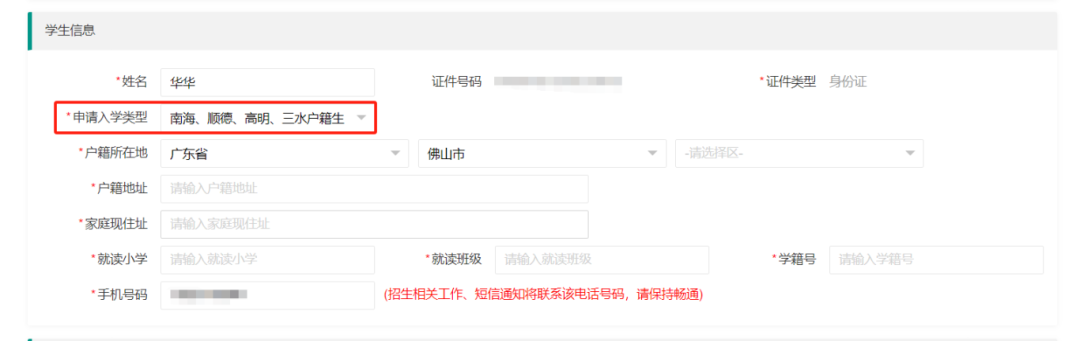 2.南海、顺德、高明、三水四区户籍小学应届毕业生:【申请入学类型】选择“南海、顺德、高明、三水户籍生”。