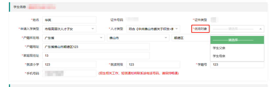 4.各类教育优待对象子女:【申请入学类型】选择“各类教育优待对象子女”→【教育优待对象子女】选择家长所属的类型进行填报→【优待家长】选择符合条件的一方身份。