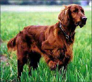 爱尔兰雪达犬全身呈桃木心红或浓艳的栗红色。有倾斜着的较长的头部,它的头部是非常漂亮的。个头中等的眼睛是类似杏仁形状的,长的是比较分开的,是不会向里凹陷也不会向上突出的,从深褐色至中褐色不等的颜色。耳朵的位置低,并且是向后靠的,悬挂着的耳廓很薄,和头部是紧紧的贴着的,耳朵的长度大约是可以伸到鼻尖处的。爱尔兰雪达犬有非常结实的颈部,却不是很粗壮的,有些呈圆拱形的,长度中等,非常自然、平滑的与肩部相连接,不会出现赘肉的。从其肩膀至尾巴这一段,十分的稳当、牢固,稍微有些倾斜,是向下的,但不会出现非常明显向臀部的下垂。爱尔兰雪达犬尾根的位置和臀部是在同一平面的,如同是自然伸展的背线,向尖端一点点的变细,十分的精致。长度几乎可以伸展到飞节部位的。姿势可以是向上举者,非常的直,也可以是稍微向上弯曲的,几乎和背部相平。爱尔兰雪达犬的胸部非常的深,几乎可以伸展到肘部的位置,胸部的宽度合适,不会阻碍前肢的动作的,肋骨向后延伸的,有良好的扩张性能。