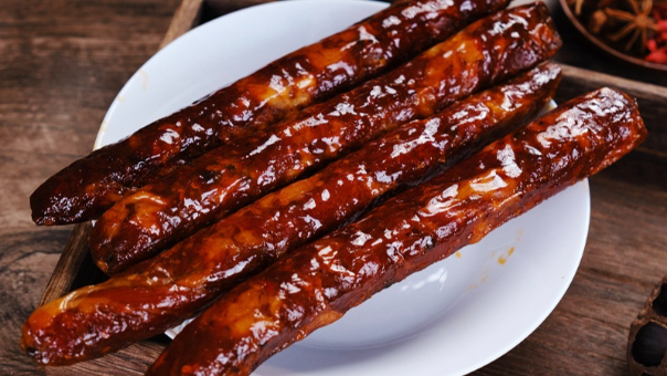 卖的是十元三串,分两种,一个是腊肉串,一个是腊肠串,也可以混着买,不建议吃腊肉,有点腻,味道也一般般,不如腊肠的滋味丰富多彩,一串三片,一口咬下去鲜香满口,每一口嚼劲十足,脆脆的琥珀色外壳包裹着醇厚的肉馅,散发出勾魂的香气,麻辣的恰到好处,特殊的腊制香味充盈齿颊,为什么说这个腊肠是勾人魂魄呢,是吃不腻,吃了一串想两串,吃了两串想三串。