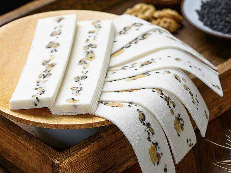 薄薄的一片一片洁白轻盈,整整齐齐的码在盒子里,有一公分宽,五公分长,因为切的薄,中间的核桃片都微微透亮,狭长斜斜的铺开,核桃四周星星点点夹杂着玫瑰花,黑芝麻点缀,姑娘买了一盒玫瑰味的,我勉为其难,真是的勉为其难的尝了尝,结果是让人惊艳,第一,这个桃片很新鲜,这个现切,看来不是噱头,是真的现切的,第二不是那么甜腻,松软可口,核桃醇香细腻,玫瑰浓郁芬芳,鲜甜可口。确实很好吃,我连着吃了好几片,当时就买了一小盒,认为到处都有卖的,结果这点东西出了磁器口,别处就没有这样现切的卖,都是各种包装,严严实实,精精致致,看着倒不如磁器口随便拿个塑料盒装鲜亮好看,这一盒没等出重庆就吃完了,后续在各个街道商铺景点也踅摸着买来,可是真的没有这个现切的,遗憾。