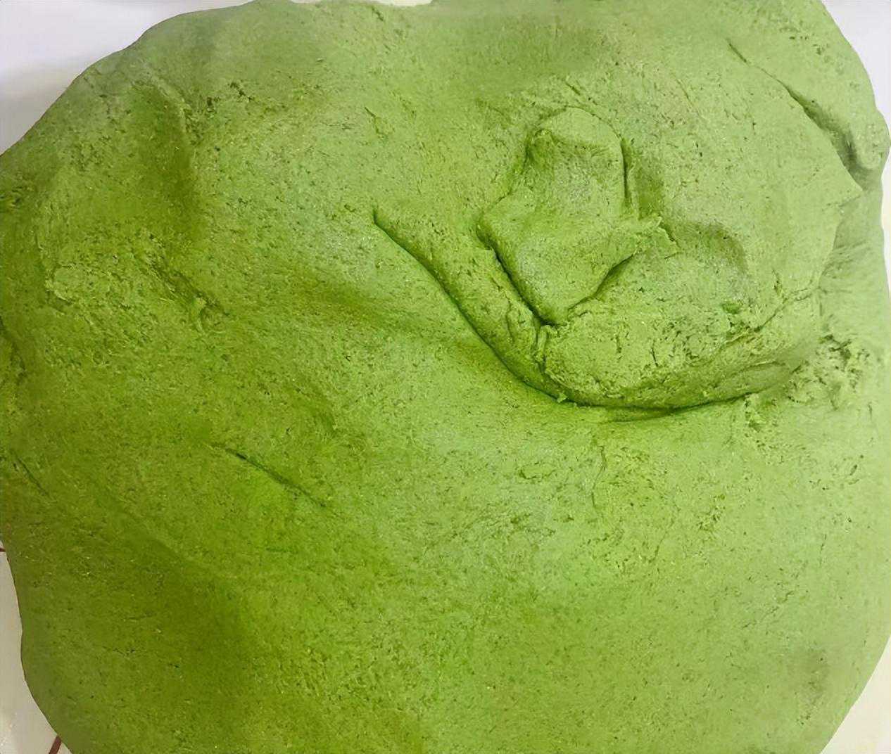 4、鼠曲草泥里加入适量的糯米粉、澄粉混合拌匀,揉成不沾手的面团。
