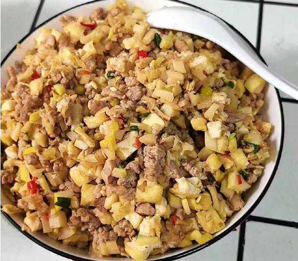 5、准备馅料,热锅凉油下入肉末炒香,下入春笋丁(煮好)、香干丁一起炒香,加入少许的生抽、蚝油、少许盐调味,翻炒均匀即可。(这里做的是咸口的馅料,也可以做豆沙馅的,根据自己的喜好来调。)