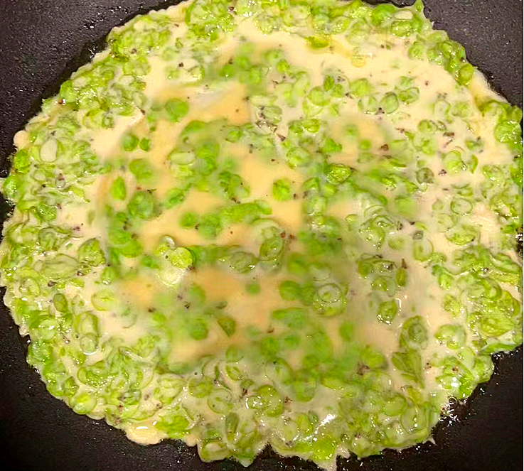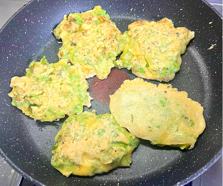 5、热锅凉油,倒入搅拌好的榆钱鸡蛋面糊下锅煎。煎至两面焦黄熟透即可。