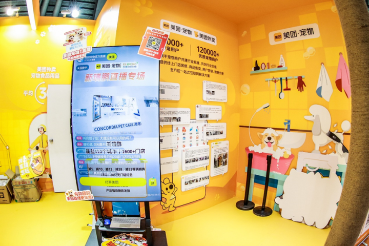 亚宠展现场,美团宠物展台吸引众多消费者打卡体验。摄影:裴虞斌