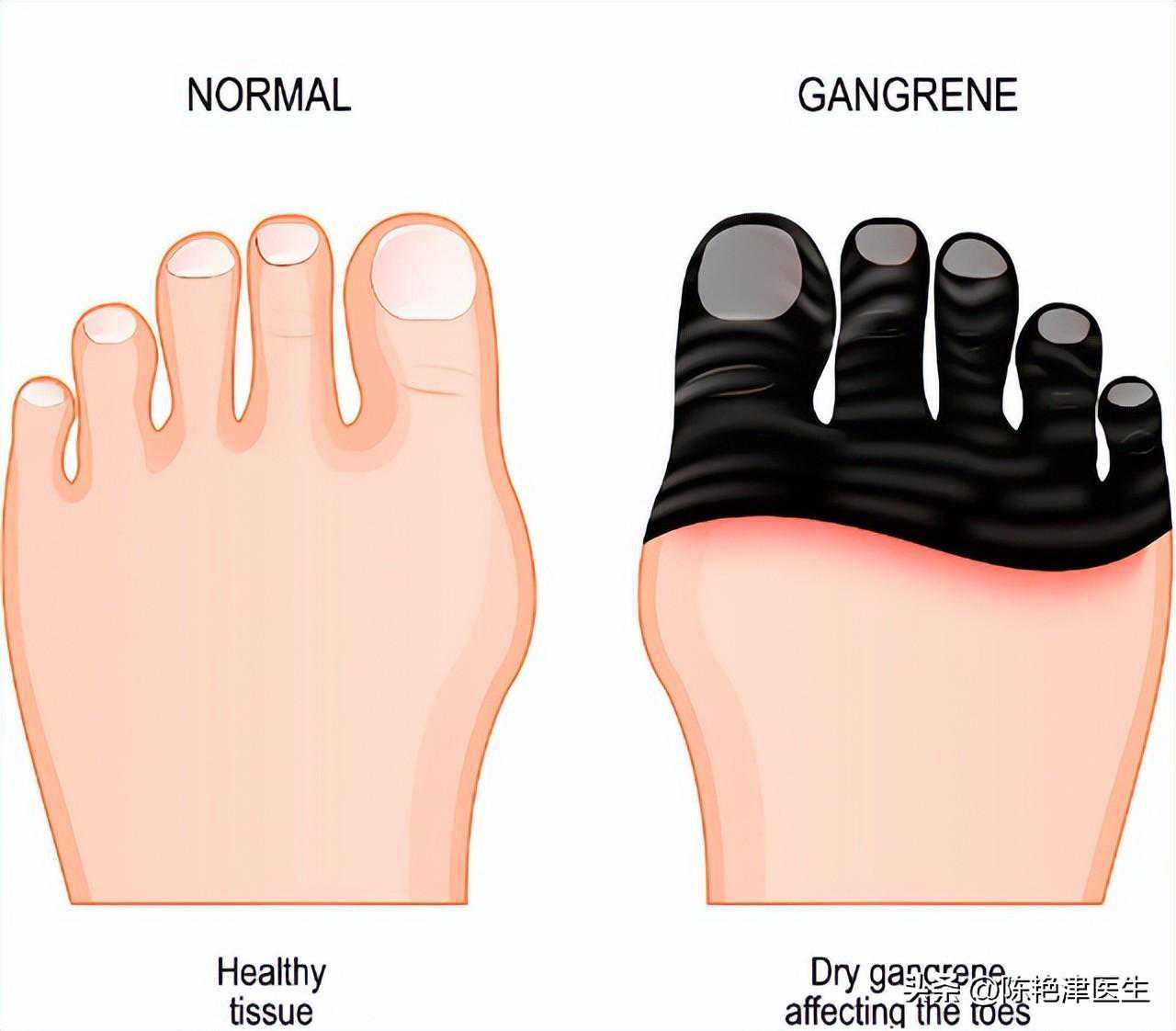 下肢动脉硬化性闭塞症的后期,因动脉完全闭塞或血栓形成,血流中断,使肢体出现明显的缺血性坏死,导致足趾发黑、变硬、坏死,出现坏疽,疼痛剧烈。