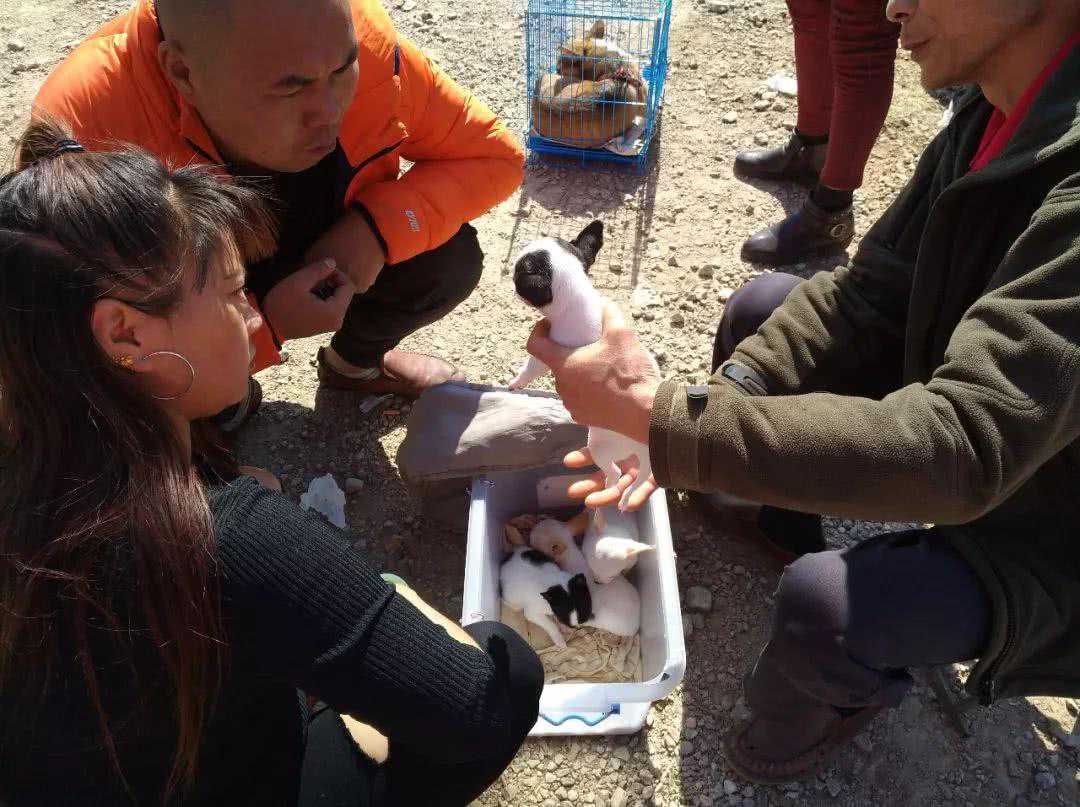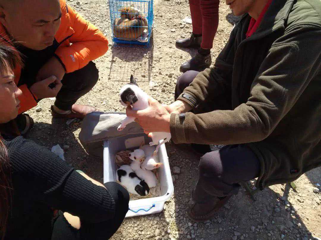 图为商户将狗狗抱出像买主近距离展示,可以看出狗狗的健康状况不错,毛发在阳光下有轻微的反光,顺滑但不显油腻,眼睛也是炯炯有神,看来商户平时对狗狗也是花了不少心思的。狗狗虽然被举起,但是似乎并不怕生,比较顺从的配合了买主的检查,并没有惊慌吠叫,这让买主非常满意,初步检查没有问题后便开始跟商贩议价。