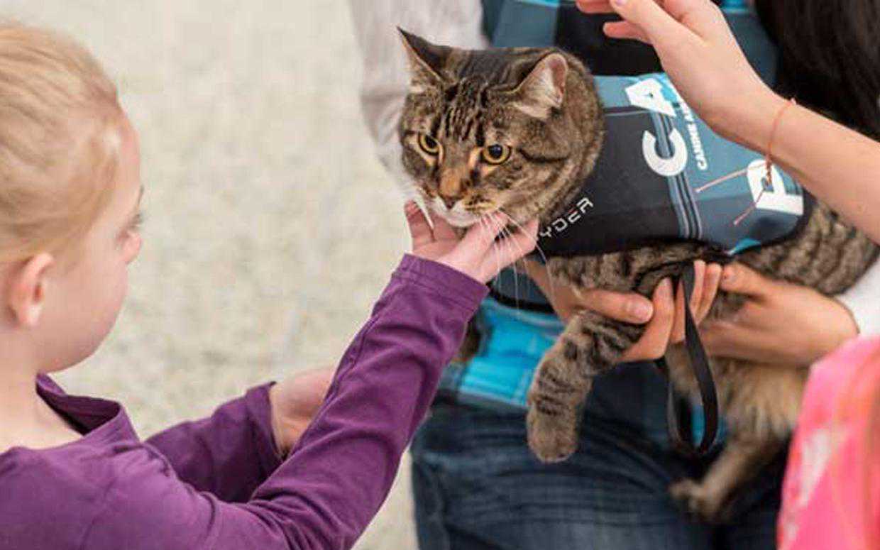 比起其他动物,猫不是一个比较常见的选择,但许多猫也可以成为很好的治疗动物。就像狗一样,猫很容易被带进养老院和医院等,以帮助安慰任何可能丢失宠物的人。许多治疗猫学会了用皮带走路,对于学校里的孩子、在辅助生活设施里的老人来说,它是一个人畜无害的存在。对于害怕狗的人来说,猫可以代替成为很好的治疗动物。