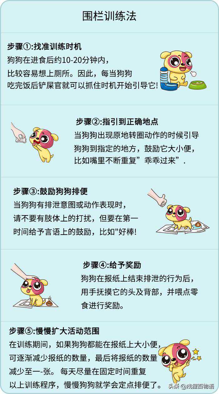 狗狗排泄后,铲屎官应先将狗狗抱到围栏外,再收拾围栏里的便便。千万不要在狗狗还在围栏里时就直接收拾狗狗的排泄物,因为这会让狗狗错以为你在跟TA玩,于是将笼子搞得一团糟!