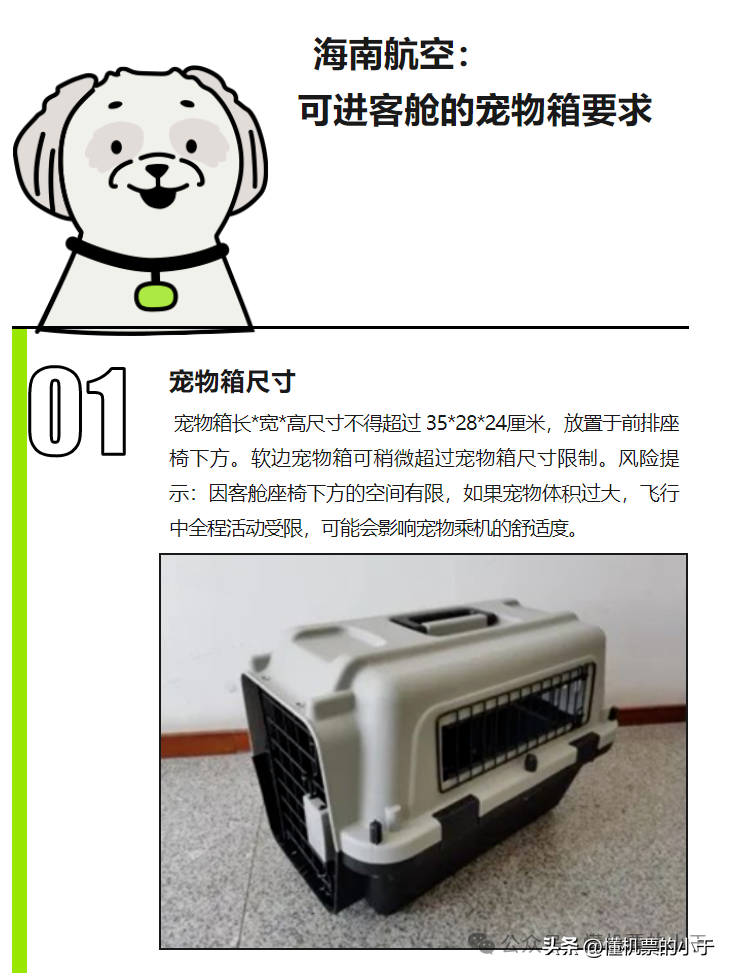 宠物+箱重不超5kg,箱尺寸不超35x28x24cm,需用软质、防渗透、防咬开宠物箱。