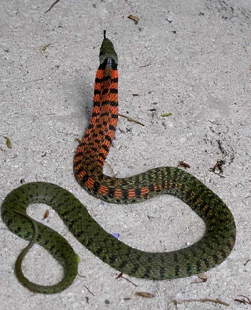 而虎斑颈槽蛇则完全不同,它不光颜色十分的艳丽,而且是一种拥有剧毒的蛇类,而它最为出名的特点就是。