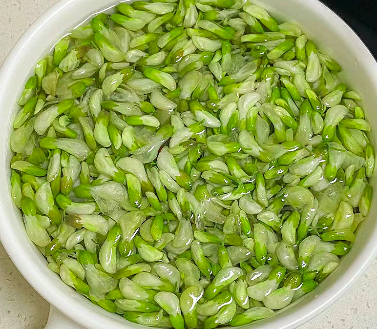 2、清洗干净沥干水待用。新鲜的槐花洗净其实就可以直接用来做馅料了。