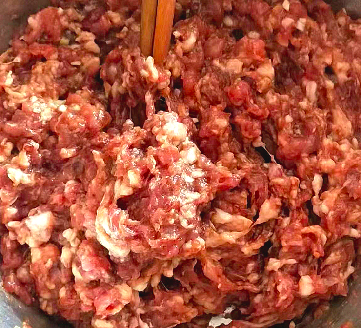 4、猪肉洗净剁碎成肉馅,加入葱姜水搅拌肉馅吸饱水分。