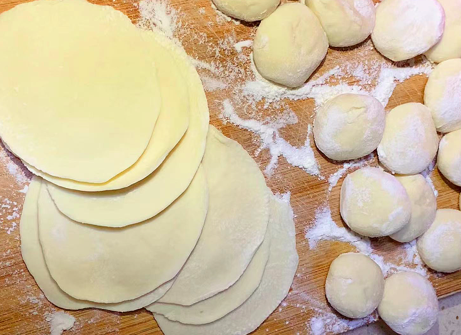 6、面粉加水揉成团,然后切成小面剂子,擀成饺子皮。
