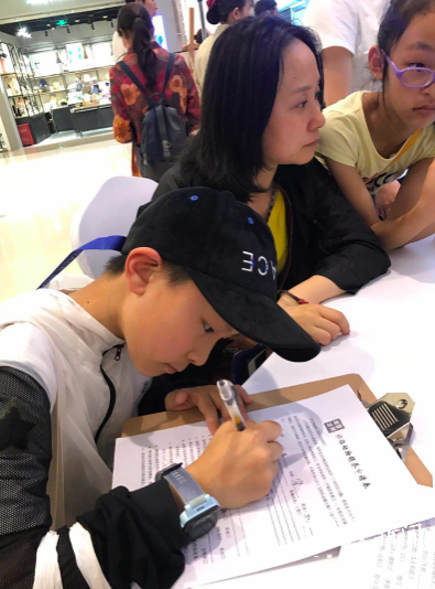 11岁的王梓臣跟妈妈一起来到领养台填申请表。“来,你自己填写吧,最后还要签上你的名字。”妈妈把表交给王梓臣,让他自己填写。名字,年龄、是否养过宠物、宠物生病的情况下是否会就医、每月计划给宠物的开支……申请表上总共有21个问题。填完表,妈妈拿起来检查了一遍,指着签名的地方:“来,把你的名字写上。签了名,你就要对它负责,对这条生命负责,这就是你的责任了。”