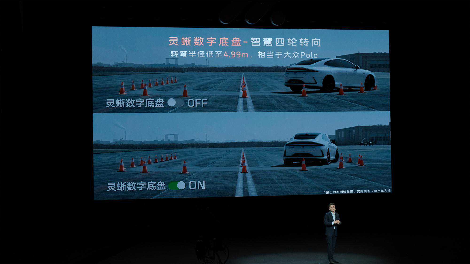 在「后轮转向」(全系标配)的功能配合下,「灵蜥底盘」让智己L6成为了国内首个能『蟹行』的轿车,这意味着横着走不再是比亚迪的高端专属。