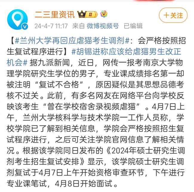 总之,虐猫行为是一种不道德的行为,它违背了社会公德和人类文明的基本原则。在校园招聘中,如果发现学生存在此类行为,学校有权采取相应的措施进行处理。但同时,我们也应该意识到教育的本质是引导和帮助学生成长,而不是简单地排斥和惩罚。因此,在处理此类事件时,我们应该采取更加理性、宽容和教育性的态度,帮助学生认识并改正错误,促进他们的健康成长。