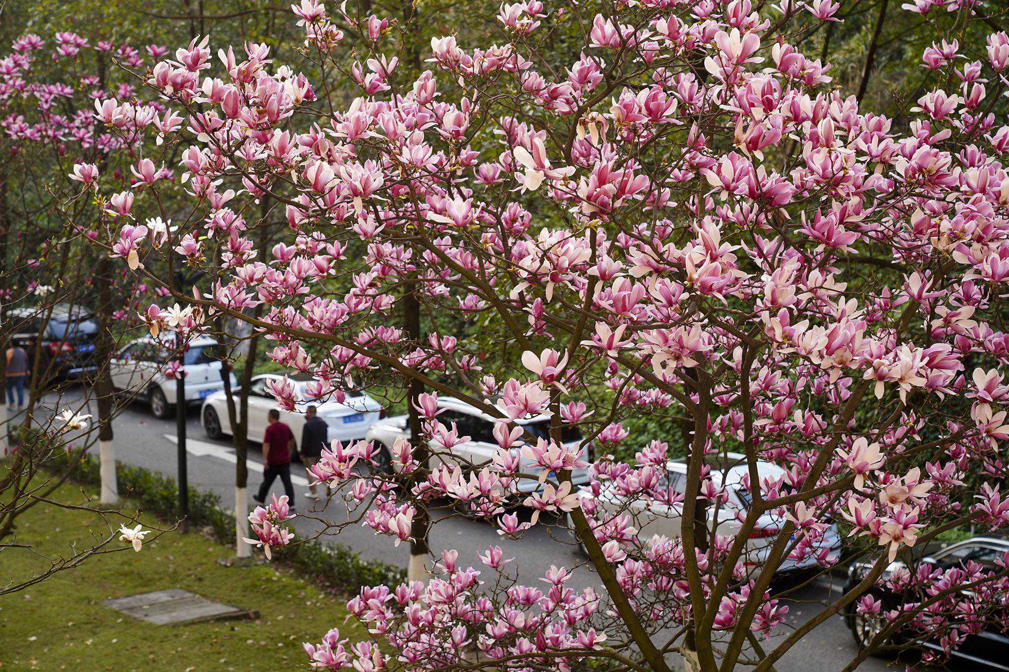 脆嫩深绿间浅绿的的树枝上,硕大的,红色的,紫色的,水粉色的花朵就是那么漫不经心独自开着。