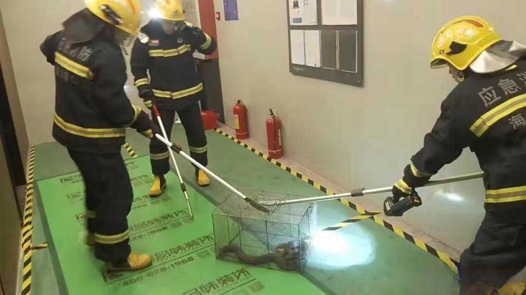 当消防员赶到事发小区后,经过一番搜寻。成功在地下车库的灭火器箱里,发现一条长约2米的蛇。