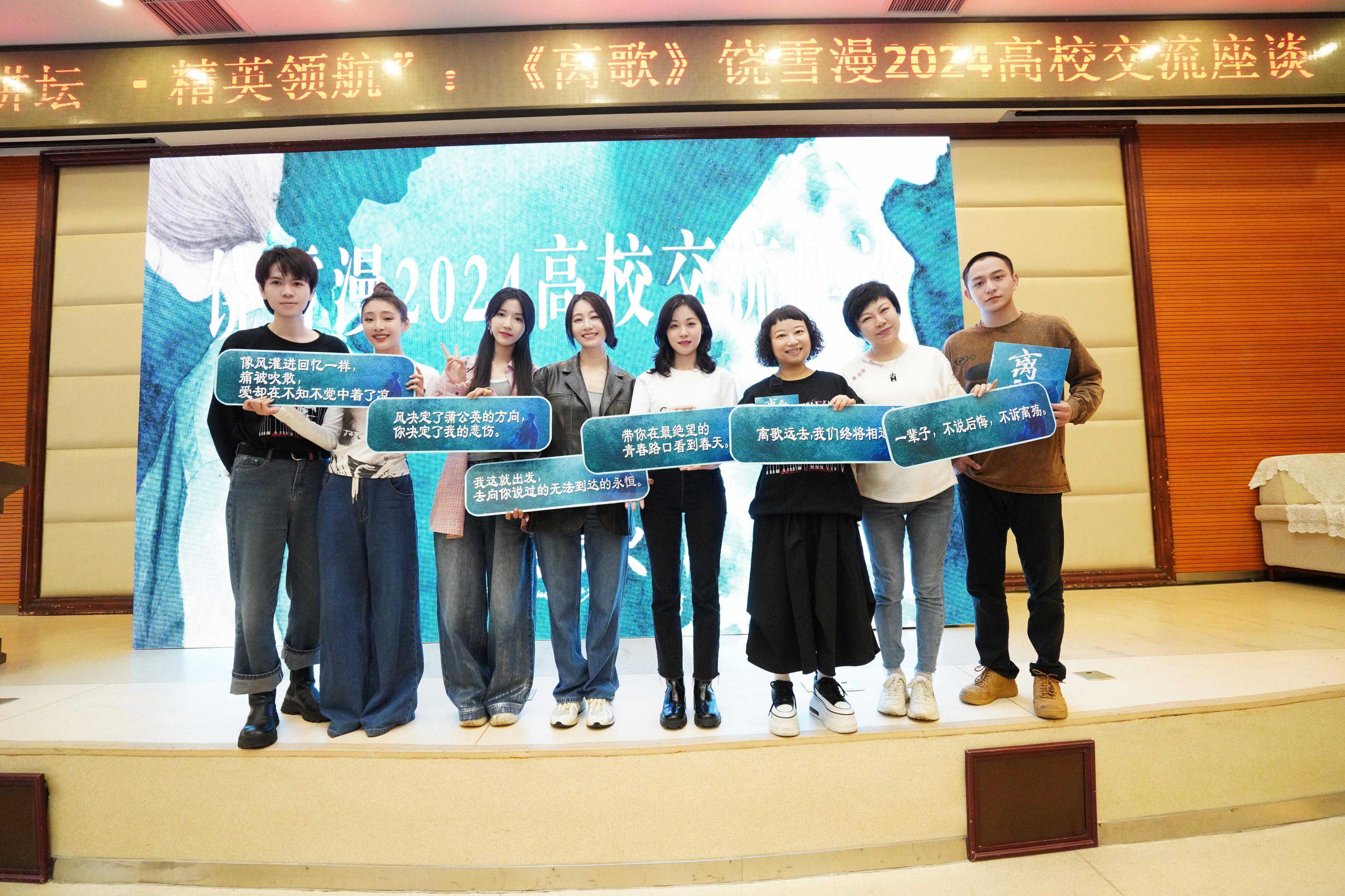 在交流环节中,《离歌》主创团队依次登台,与现场同学分享了角色感悟和拍摄趣事,学生们通过线下提问、线上微博话题讨论等方式积极互动发言,饶雪漫耐心回答、妙语连珠,同学们反响热烈,讲座现场回荡着欢声笑语。