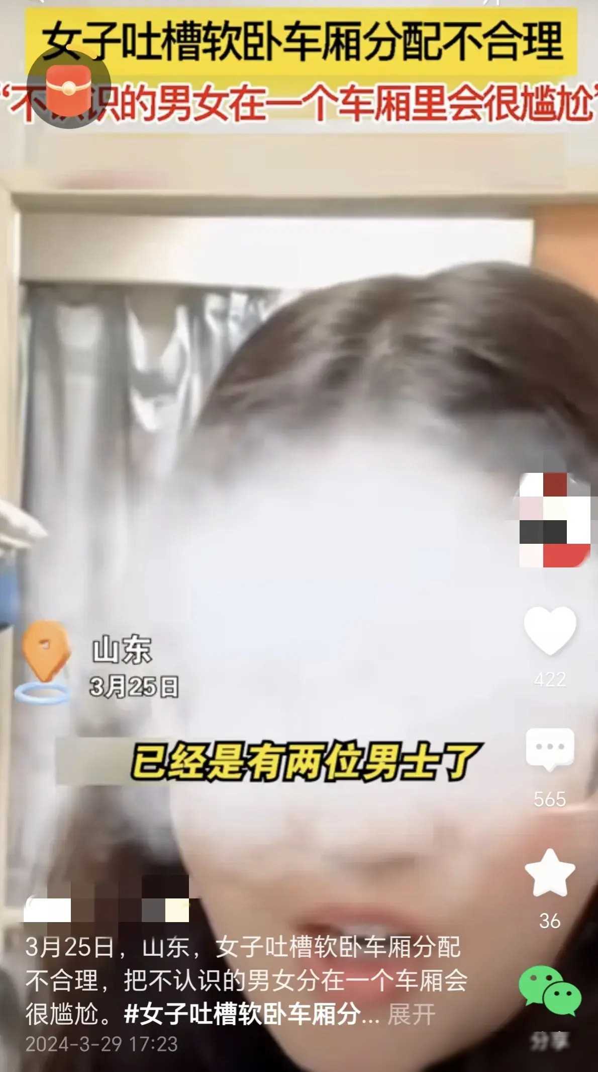 最近,一位女性乘客在社交媒体上吐槽火车软卧车厢男女混铺的尴尬情况引发了广泛争议。她在出差途中乘坐软卧列车,发现自己成为车厢里唯一的女性乘客,而其他铺位则全是男士。这种男女混铺的情况让她感到十分尴尬,认为火车售票时应该进行性别分配。