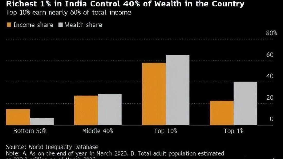2023年,印度最富有的1%人口,拥有全国40.1%的财富。