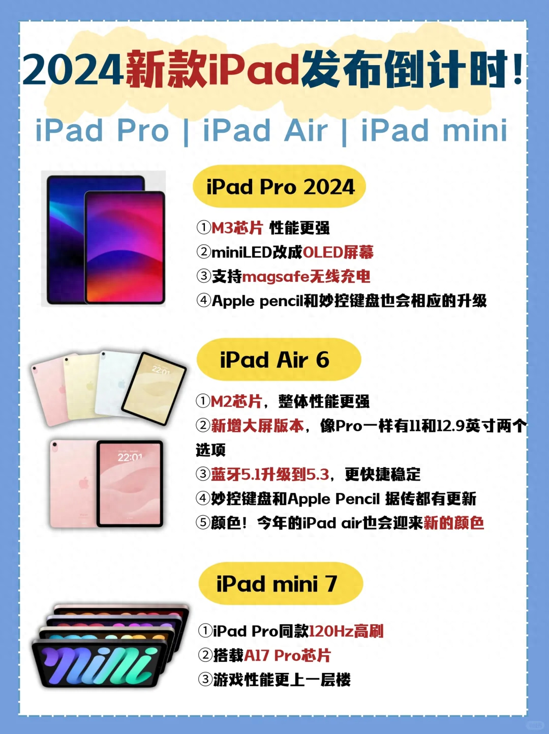 2024新款ipad一直在预热,眼看着就要发布啦,今年苹果会发布三款全新的iPad,想要入手的小伙伴快收藏起来!来看看苹果新款ipad怎么挑吧!