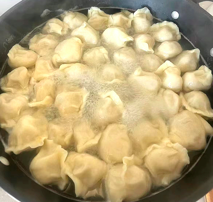 9、锅里加水煮沸,下入饺子煮,大火煮沸加入一碗冷水继续煮沸,然后再加入一碗冷水煮沸,饺子熟透即可。可以在沸水里加点盐,这样饺子皮更筋道不破皮好吃。