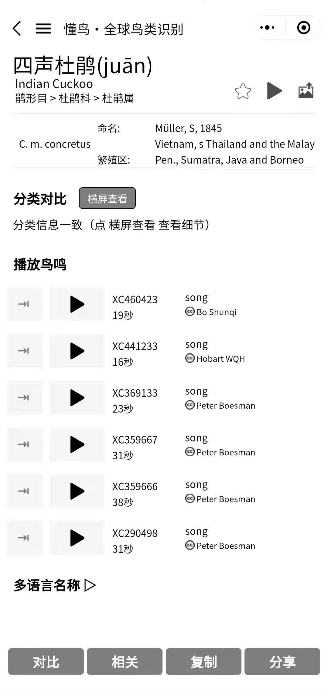 该网站可以查看的信息非常全面,如雄鸟雌鸟的身长体重、鸟种资料、IUCN等级、亚种及分布等,而且还可以播放鸟鸣。对于鸟类爱好者来说还可以小程序拍照上传识别,便于随时随地了解身边的鸟类。